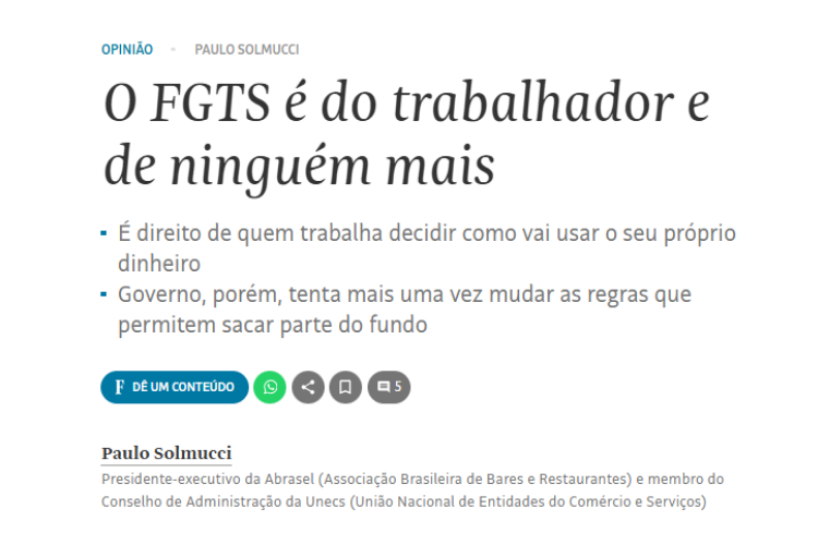 Editorial publicado pela Folha de S. Paulo, escrito por Paulo Solmucci, presidente executivo da Abrasel, critica as novas restrições impostas pelo governo federal ao saque-aniversário do FGTS, válidas desde 1º de novembro. As medidas limitam o valor antecipado a R$ 2.500 em cinco anos e estabelecem um intervalo de 90 dias entre o pedido e a liberação do dinheiro.